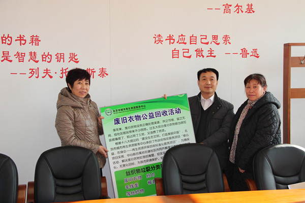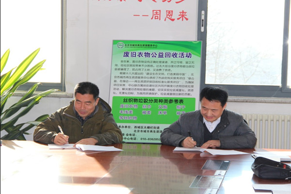 2013年12月11日上午,北京市城市再生资源服务中心与大栅栏街道办事处共同签署了“社区环保项目战略合作协议”并宣布“废旧衣物公益回收活动”在大栅栏街道正式启动,所属社区将全部统一设立废旧衣物回收站设置回收箱。会上,大栅栏街道高新贞科长向各社区主任介绍了活动的基本情况,此项活动的目的主要是解决社区居民长期没有废旧衣物正规处理渠道的问题,切实实现市市政市容委提出的垃圾减量化、资源化、无害化目标,让废旧衣物等丝织物不再成为垃圾被填埋。市城市再生资源服务中心主任刘泰原向各社区主任详细介绍了回收活动的操作程序,各社区主任对此项环保项目的开展很有信心,纷纷发言提出好的建议。