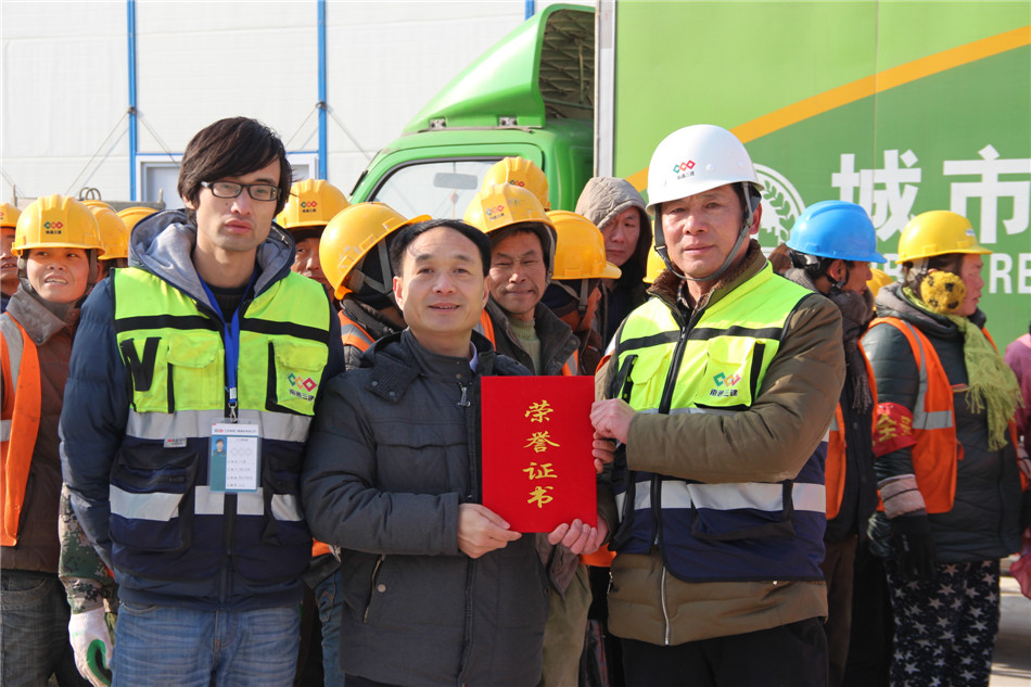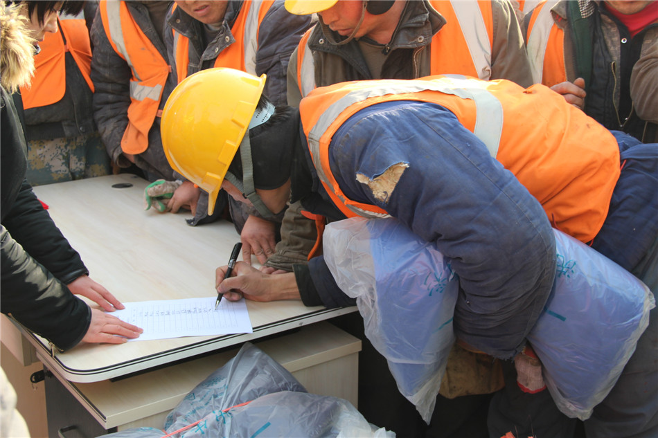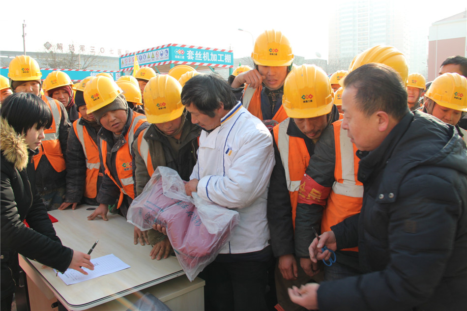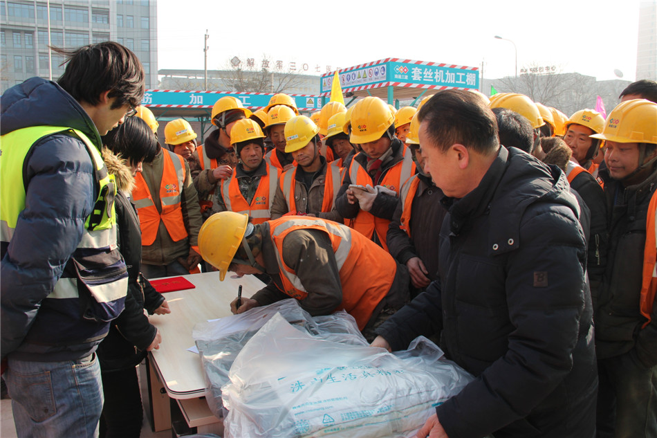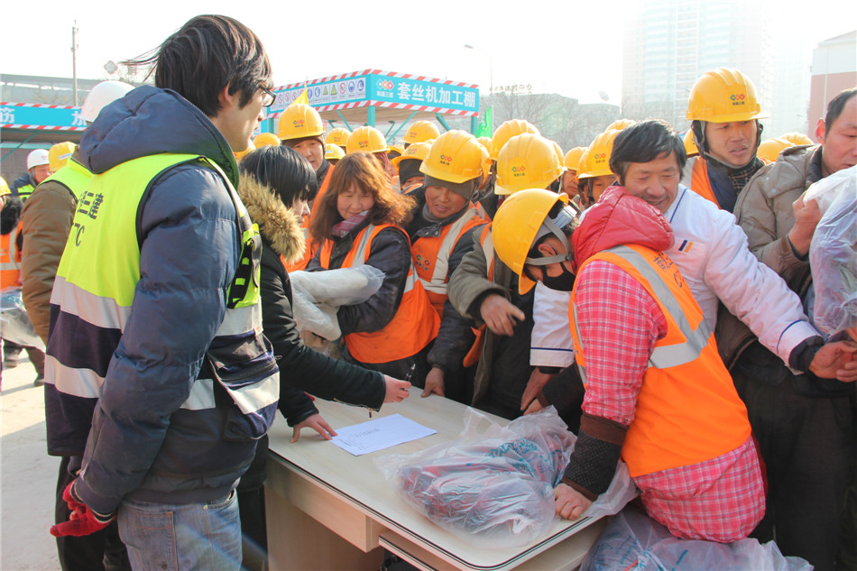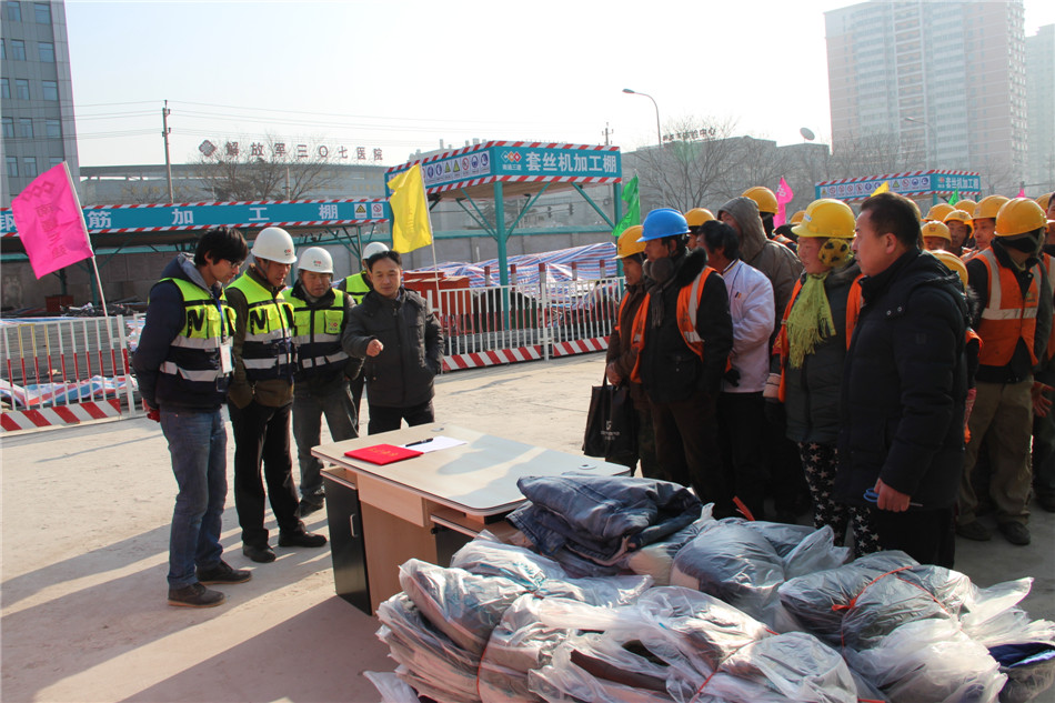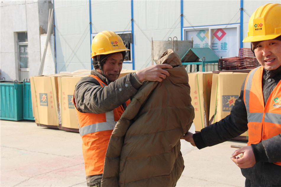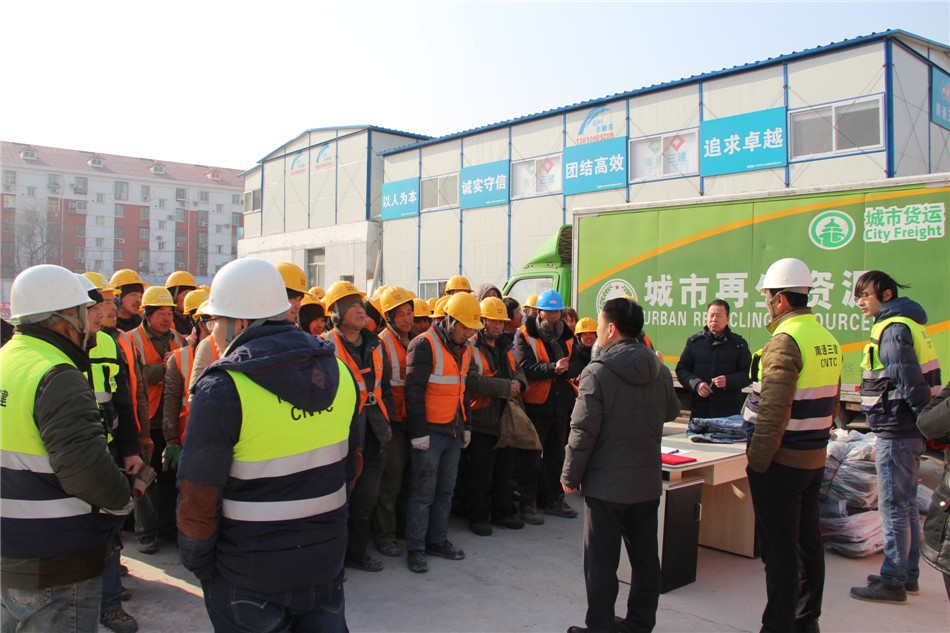 2016年1月19日,天气虽好但气温很低。北京市城市再生资源服务中心刘泰原主任,带队来到江苏南通三建集团有限公司位于北京丰台东大街5号院海军住宅楼一期工程工地,为建设美丽北京做出贡献的南通三建广大工人朋友进行慰问并表示感谢!在南通三建相关负责人陆国忠、江峰两位经理的组织配合下,市城市再生资源服务中心为该工地全体建筑工人每人发放了1-2件棉衣,得到了南通三建相关负责人和全体建筑工人的热烈欢迎。