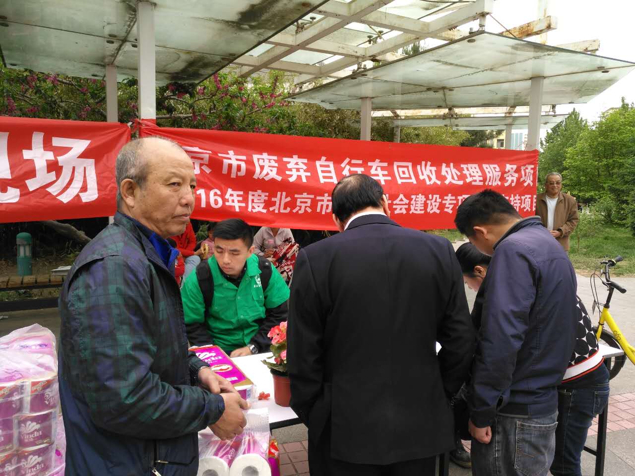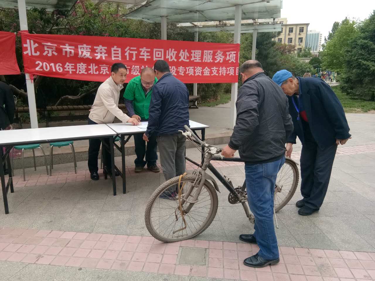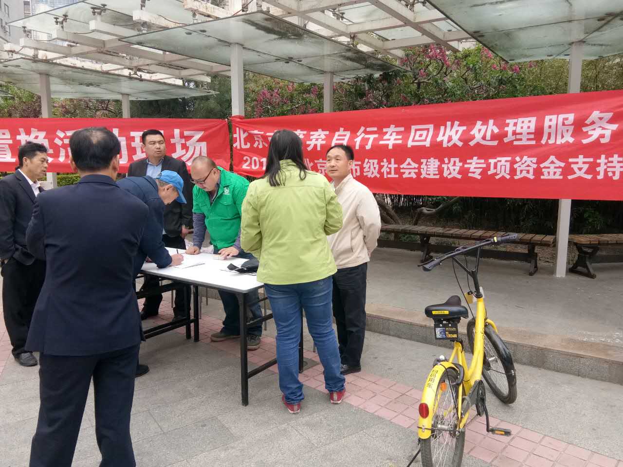 2017年4月25日,为建设生态文明首都美丽家园,在市社工委,市城管委,市交通委等相关部门及街道的支持下,北京市城市再生资源服务中心联合北京市朝阳区朝外街道吉庆里社区居委会、物业公司、ofo共享单车共同在吉庆里社区举办清理僵尸自行车公益环保活动,活动以物物置换和ofo共享单车骑行基金置换的形式开展,活动得到了社区居民一致好评并积极参与。仅仅两个多小时就置换了近200多辆僵尸自行车,该活动的开展有效的改善了社区环境,解决了废旧僵尸自行车常年堆放在居民楼的门厅楼道,给居民出行带来不便等问题,为社区居民出行带来便利。北京市再生资源服务中心刘泰原主任亲自出席了本次活动。2017年北京市城市再生资源服务中心将继续联合区县相关街道社区及共享单车企业共同开展社区僵尸自行车回收利用公益环保活动,为建设生态文明首都,美丽家园做出新的贡献。